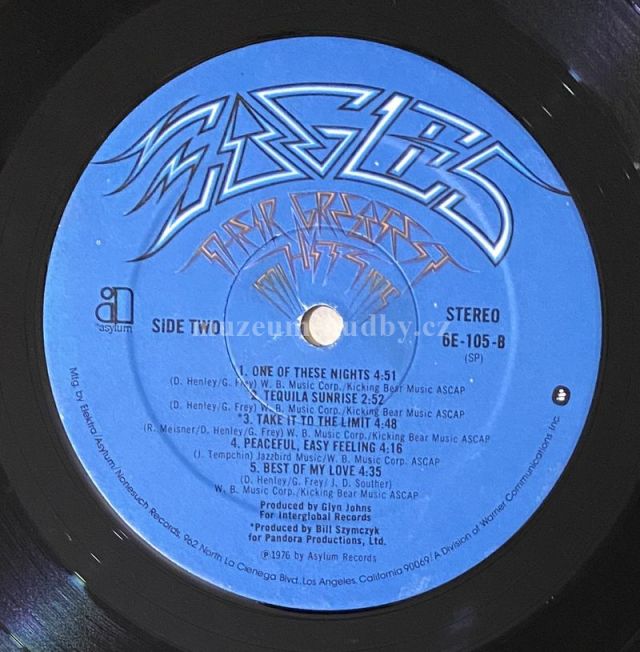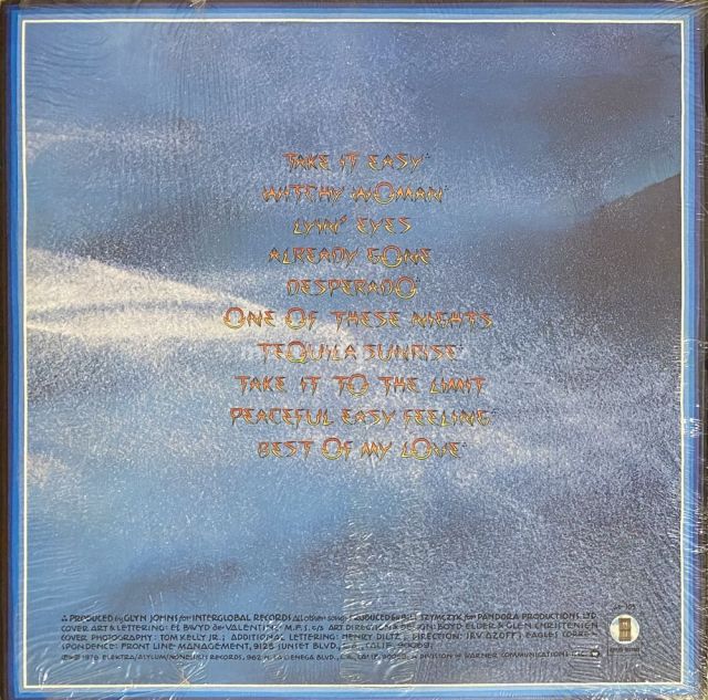 částečně zabaleno v originálním celofánu A1 Take It Easy A2 Witchy Woman A3 Lyin' Eyes A4 Already Gone A5 Desperado B1 One Of These Nights B2 Tequila Sunrise B3 Take It To The Limit B4 Peaceful, Easy Feeling B5 Best Of My Love