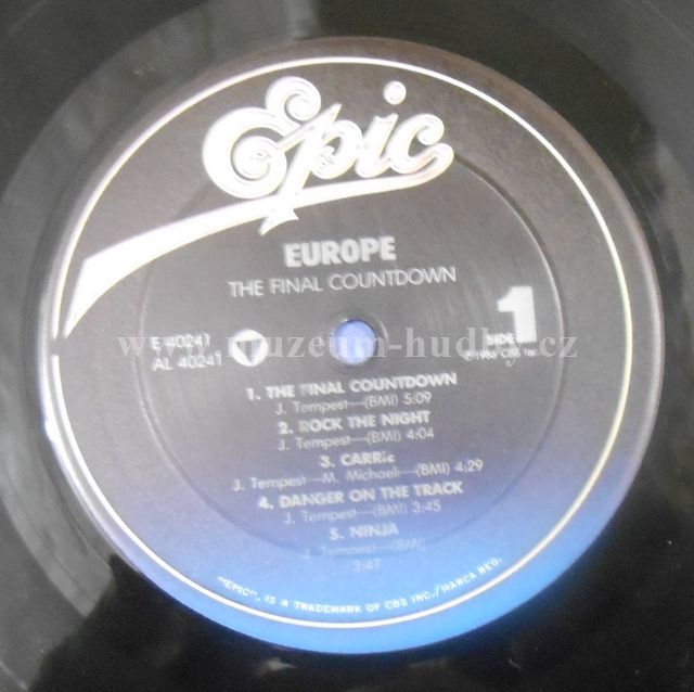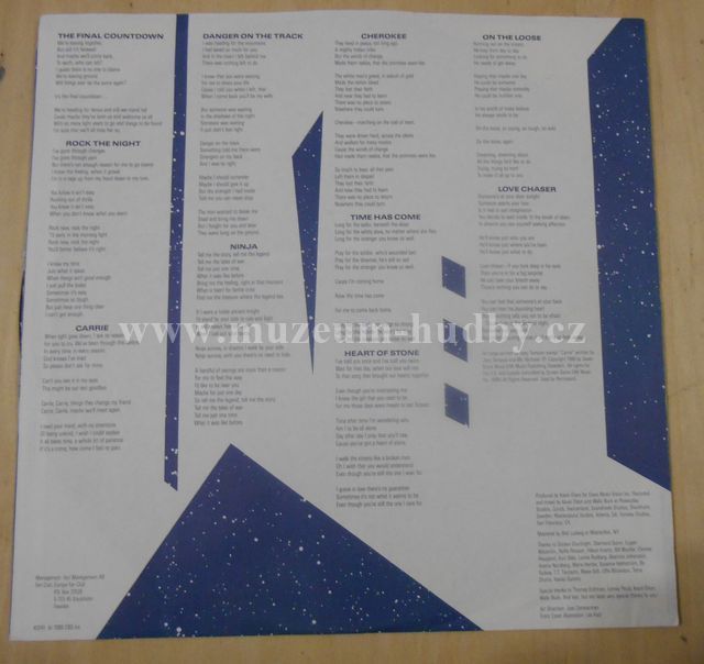 A1 The Final Countdown Written-By – Joey Tempest 5:09 A2 Rock The Night Written-By – Joey Tempest 4:04 A3 Carrie Written-By – Mic Michaeli 4:29 A4 Danger On The Track Written-By – Joey Tempest 3:45 A5 Ninja Written-By – Joey Tempest 3:47 B1 Cherokee Written-By – Joey Tempest 4:12 B2 Time Has Come Written-By – Joey Tempest 4:00 B3 Heart Of Stone Written-By – Joey Tempest 3:46 B4 On The Loose Written-By – Joey Tempest 3:08 B5 Love Chaser Written-By – Joey Tempest 3:28