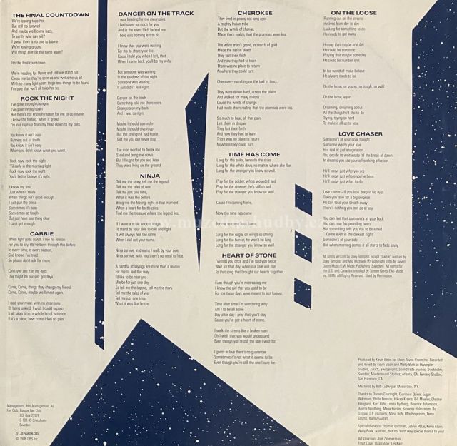A1 The Final Countdown A2 Rock The Night A3 Carrie A4 Danger On The Track A5 Ninja B1 Cherokee B2 Time Has Come B3 Heart Of Stone B4 On The Loose B5 Love Chaser