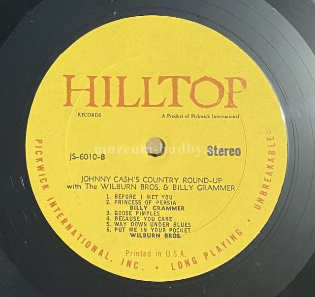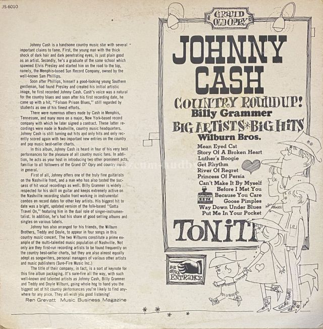 A1 Johnny Cash– Mean Eyed Cat A2 Johnny Cash– Story of a Broken Heart A3 Johnny Cash– Luther’s Boogie A4 Johnny Cash– Get Rhythm A5 Billy Grammer– Can’t Make It By Myself A6 Billy Grammer– River of Regret B1 Billy Grammer– Before I Met You B2 Billy Grammer– Princess of Persia B3 The Wilburn Brothers– Goose Pimples B4 The Wilburn Brothers– Because You Care B5 The Wilburn Brothers– Way Down Under Blues B6 The Wilburn Brothers– Put Me In Your Pocket