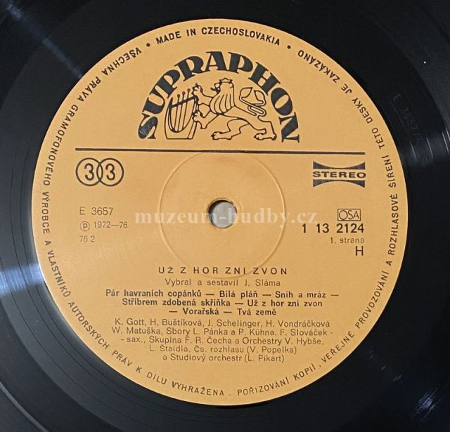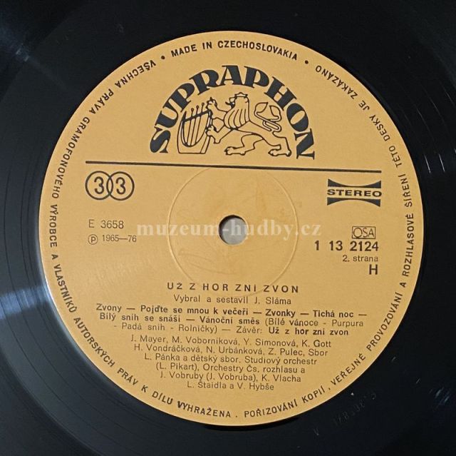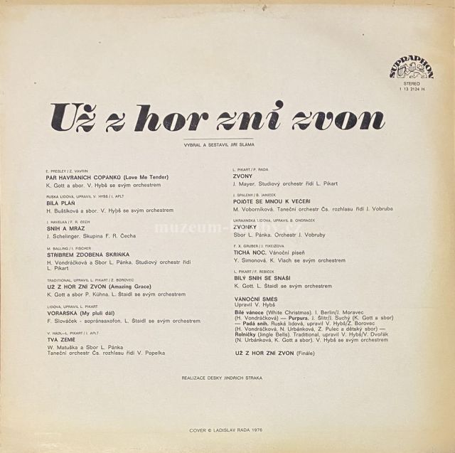 A1 Pár Havraních Copánků (Love Me Tender) Vocals – K. Gott A2 Bílá Pláň Vocals – H. Buštíková A3 Sníh A Mráz Vocals – J. Schelinger A4 Stříbrem Zdobená Skříňka Vocals – H. Vondráčková A5 Už Z Hor Zní Zvon (Amazing Grace) Vocals – K. Gott A6 Vorařská (My Pluli Dál) Tenor Saxophone – F. Slováček A7 Tvá Země Vocals – W. Matuška B1 Zvony Vocals – J. Mayer B2 Pojďte Se Mnou K Večeři Vocals – M. Voborníková B3 Zvonky Vocals – Sbor L. Pánka B4 Tichá Noc Vocals – Y. Simonová B5 Bílý Sníh Se Snáší Vocals – K. Gott* Vánoční Směs B6a Bílé Vánoce Vocals – H. Vondráčková B6b Purpura Vocals – K. Gott B6c Padá Sníh Vocals – H Vondráčková, N. Urbánková, Z. Pulec B6d Rolničky Vocals – N. Urbánková, K. Gott B7 Už Z Hor Zní Zvon (Finále)
