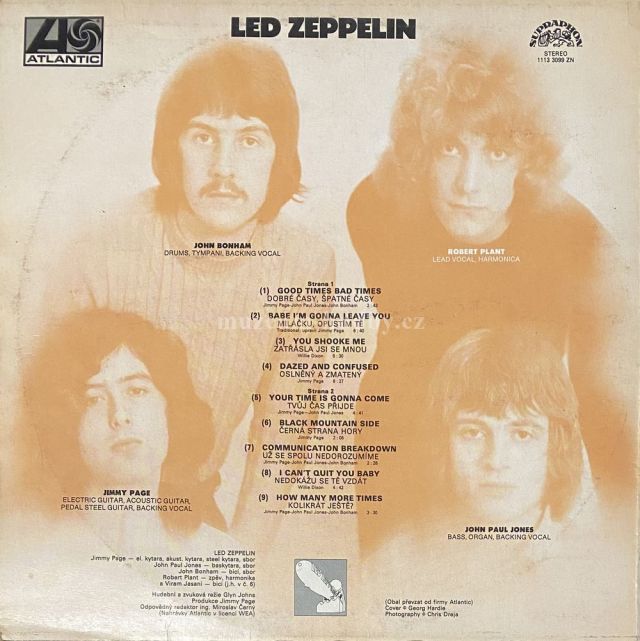 A1 Good Times Bad Times = Dobré Časy, Špatné Časy A2 Babe I'm Gonna Leave You = Miláčku, Opustím Tě A3 You Shook Me = Zatřásla Jsi Se Mnou A4 Dazed And Confused = Oslněný A Zmatený B1 Your Time Is Gonna Come = Tvůj Čas Přijde B2 Black Mountain Side = Černá Strana Hory B3 Communication Breakdown = Už Se Spolu Nedorozumíme B4 I Can't Quit You Baby = Nedokážu Se Tě Vzdát B5 How Many More Times = Kolikrát Ještě?
