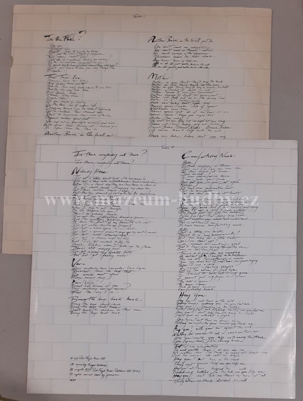 desky jako nove A1 In The Flesh? A2 The Thin Ice A3 Another Brick In The Wall Part 1 A4 The Happiest Days Of Our Lives A5 Another Brick In The Wall Part 2 A6 Mother B1 Goodbye Blue Sky B2 Empty Spaces B3 Young Lust B4 One Of My Turns B5 Don't Leave Me Now B6 Another Brick In The Wall Part 3 B7 Goodbye Cruel World C1 Hey You C2 Is There Anybody Out There? C3 Nobody Home C4 Vera C5 Bring The Boys Back Home C6 Comfortably Numb D1 The Show Must Go On D2 In The Flesh D3 Run Like Hell D4 Waiting For The Worms D5 Stop D6 The Trial D7 Outside The Wall
